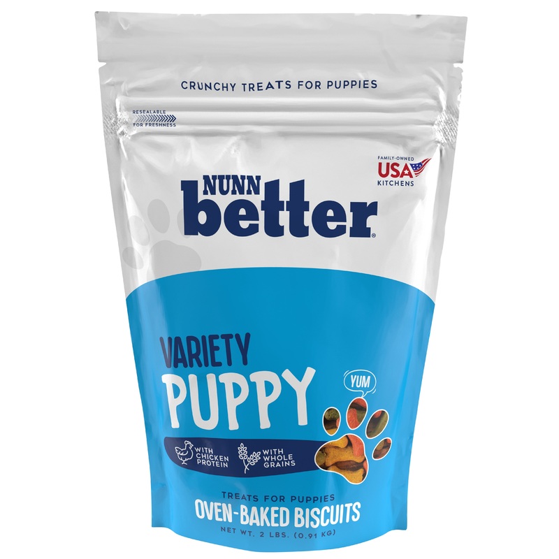 Nunn-Better delicious puppy treats are the perfect reward for your furry friend. They also make great training aids. Made with chicken protein, whole grains, oatmeal, pumpkin, and sweet potatoes to help support good health. These treats are packed full of nutrition and have a flavor your puppy will love! The crunchy texture also helps remove tartar build-up on your puppys teeth to help promote healthy gums.