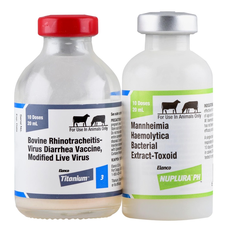 Nuplura PH+3(Elanco)(MLV)(BVD types 1 & 2) Mannheimia Haemolytica.Proven effective against disease caused by bovine viral diarrhea (types 1 & 2), infectious bovine rhino tracheitis and respiratory disease caused by M. Haemolytica. For the vaccination of he