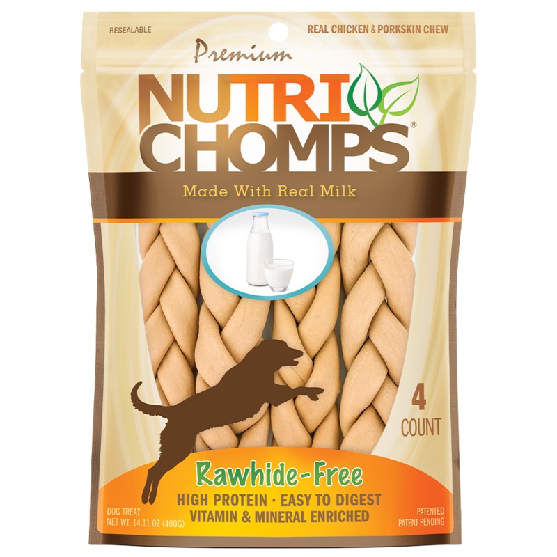 9 Milk Braids 4 CountNutriChomps 9 Milk Braids, made with real chicken, pork skin and milk, are sure to become your dogs favorite treat. They are vitamin and mineral fortified, making them as delicious as they are nutritious. Along with savory protein from
