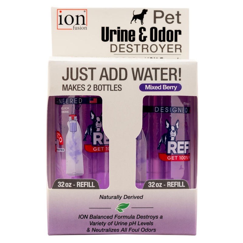 Pet Urine & Odor Destroyer Refill, Mixed Berry, 2-pkA 2 pack refill for the Pet Urine & Odor Destroyer. Each refill makes 32 oz for a total of 64 oz and has a Mixed Berry scent. Patented Quick Release Refill System Proprietary technology allows you to refi