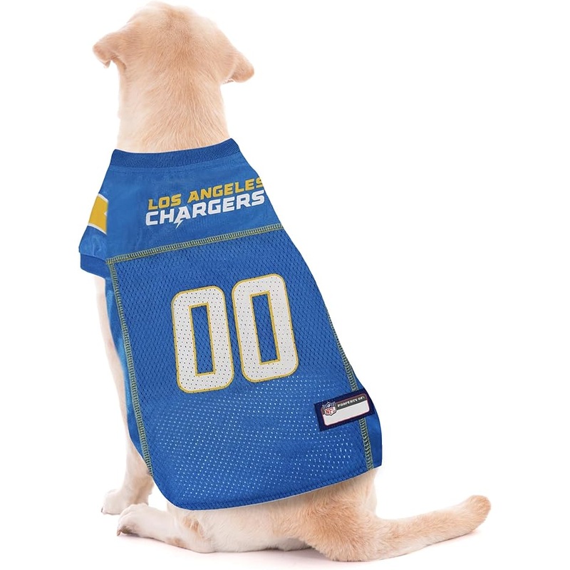 Remember to measure your pet for the paw-fect fit.Let your four-legged friend show some love for her favorite football team with the Pets First NFL Dog Jersey. Shell be ready for game day in this jersey which features the official team colors, team name and number on the back and the team logo on the front. Made from satin and breathable poly mesh, this jersey is comfortable, durable and stylish. It also has sporty stripes on the sleeves just like the pros! The NFL property of jock tag allows you to add a touch of style and personalization, because win or lose, shell still be your MVPMost Valuable Pet, that is!