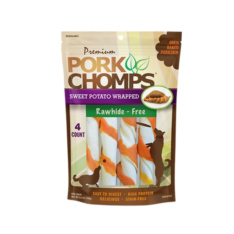 Premium Pork Chomps 6 Pork Skin Twists Wrapped with Real Sweet Potato are fully digestible and the perfect rawhide alternative for your pup!! Pork Chomps are made from baked pork skin creating a healthy, low fat, high protein dog chew. This wholesome chew has no artificial flavors or dyes, and is preferred by dogs everywhere! Premium Pork Chomps are the long lasting rawhide alternative that will keep you pup constructively chewing for hours! In 2012, The University of Illinois College of Veterinary Science conducted a study which proved pork skin to be 99.9% digestible and significantly more digestible than beef rawhide. Offering a variety of sizes, shapes and flavors, Premium Pork Chomps is the chew dogs crave and pet parents can feel good about too! Safe and Healthy Premium Pork Chomps 6 Pork Skin Twists Wrapped with Real Sweet Potato are the right size for Small Dogs, Medium Dogs and Large Dogs. 4 Count Resealable Package