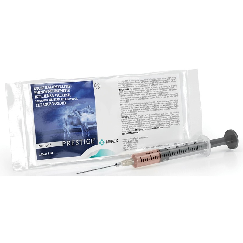 Prestige 5 is for the vaccination of healthy horses 6 months of age or older as an aid in the prevention of disease caused by Eastern & Western encephalomyelitis viruses, EIV, EHV-1, EHV-4 (Rhino), Tetanus.