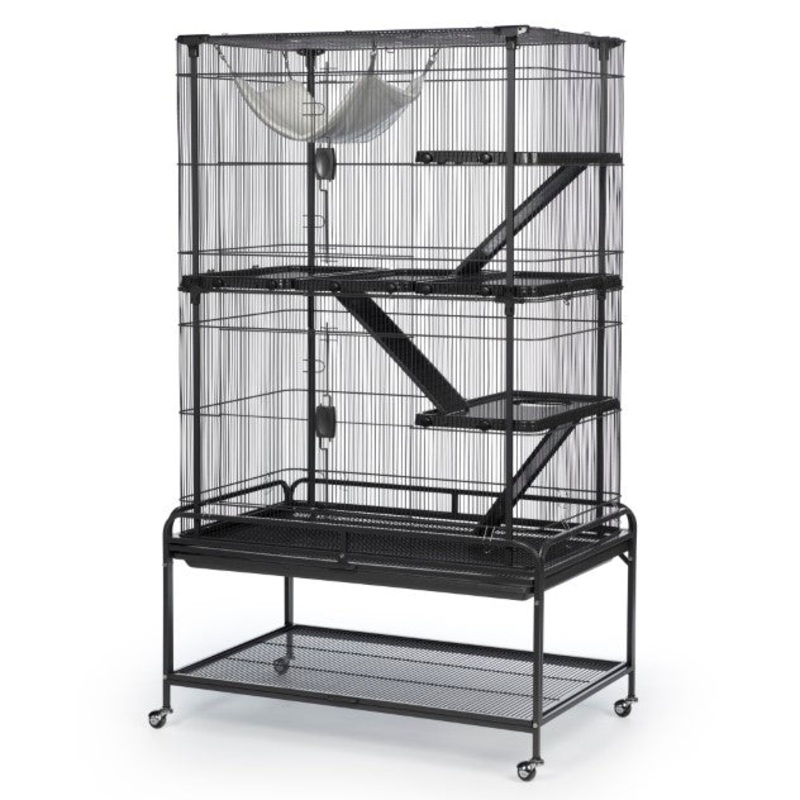 Prevue Pet Products Deluxe Critter Cage 484 is a safe and spacious home for a wide variety of small animals. Exceptional engineering makes our critter cage easy to assemble and provides a paw friendly design – no gaps or pinch points! Lightweight channel construction is heavy duty with rails, clips and alignment tabs to keep cage parts aligned, strong and sturdy. Cage comes complete with five shelves with twist knob closure, three ramps and a super soft plush hammock. Pet parents can comfortably access the cage interior through two large entry points, cage doors close easily and securely with our simple two-finger locking mechanism. Doors swing open wide providing full interior cage access for interacting with your pet or cleaning. The removable grille and tray make this cage easy to clean and are held in place with a windbell lock. A solid fit into the cage base provides extra stability while metal and hard rubber casters allow you to easily move the cage and lock into place as needed. Use the built in shelf to store extra toys or treats. Expertly engineered in the USA, all Prevue cages undergo independent lab testing to conform to the highest levels of pet safety. Suitable for small animals, ferrets, sugar gliders, rats, chinchillas, hedgehogs, tortoises, lizards, chameleons, iguanas and more, our Deluxe Critter Cage measures 37 long, 23 1/8 wide and 63 3/8 high (including the stand) with 7/16 wire spacing. Replacement platforms and ramps available separately.