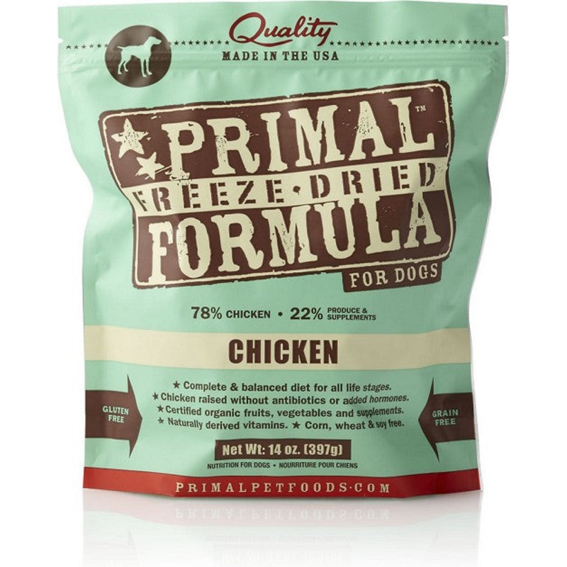 Primal Chicken Formula Nuggets is a grain-free and gluten-free freeze-dried dog food made in the USA. It is a complete and balanced diet for all life stages. The chicken is raised without antibiotics or added hormones. It is also corn, wheat and soy free.