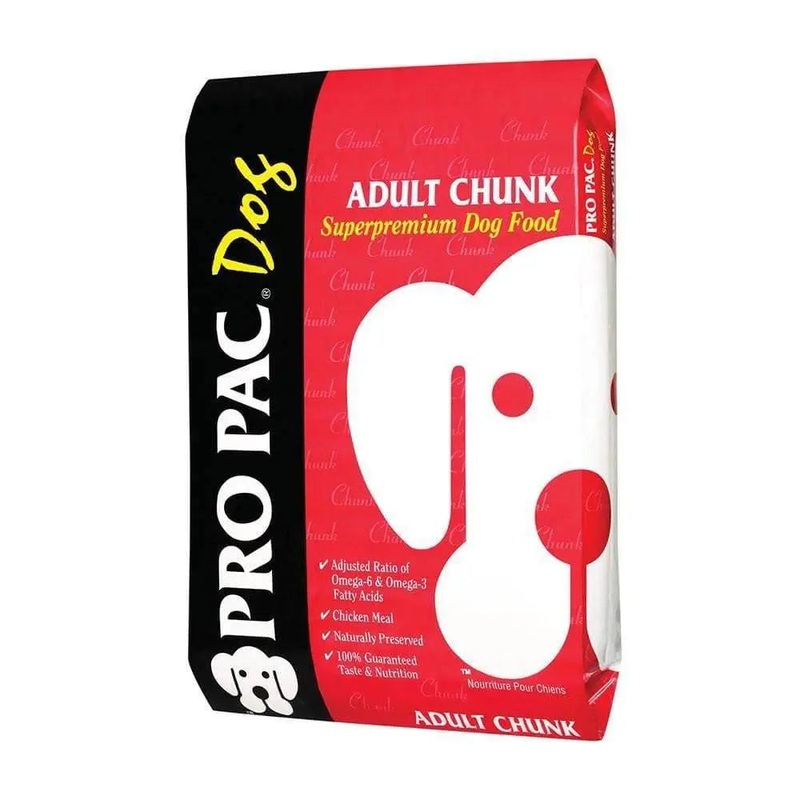 PRO PAC Adult Chunk is specially designed for the normally active adult dog. High-quality chicken meal is the primary ingredient. It is combined with high-quality chicken fat. That makes PRO PAC Adult Chunk highly palatable and easy to digest. The superpremium nutrients in PRO PAC provide for strong bones, excellent muscle tone, shiny coat, and firm, consistent stools PRO PAC Adult Chunk formula contains no by-products and are naturally preserved.