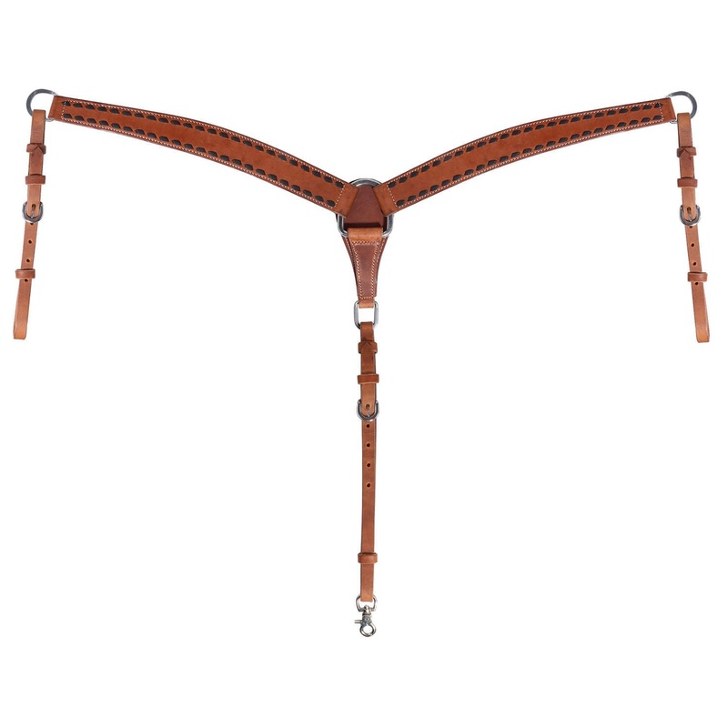 Buckstitch Harness Leather Breast CollarBuilt to look good and work hard, This breast collar is made from durable harness leather with a dark buck stitched border. Made with stainless steel hardware.