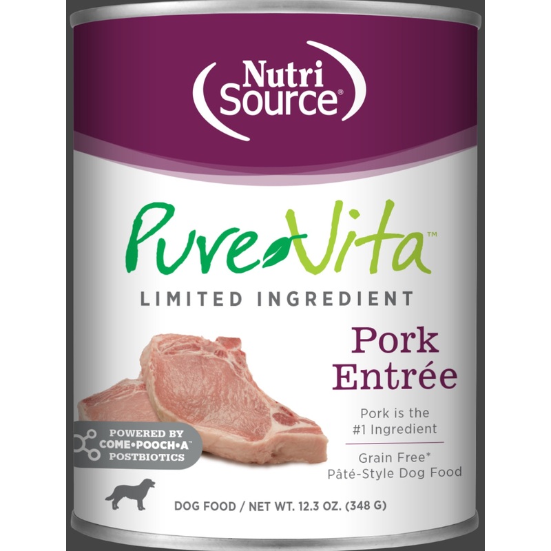 - NutriSource PureVita Pate-Style dog food features meat rich, single source animal protein dense recipes.