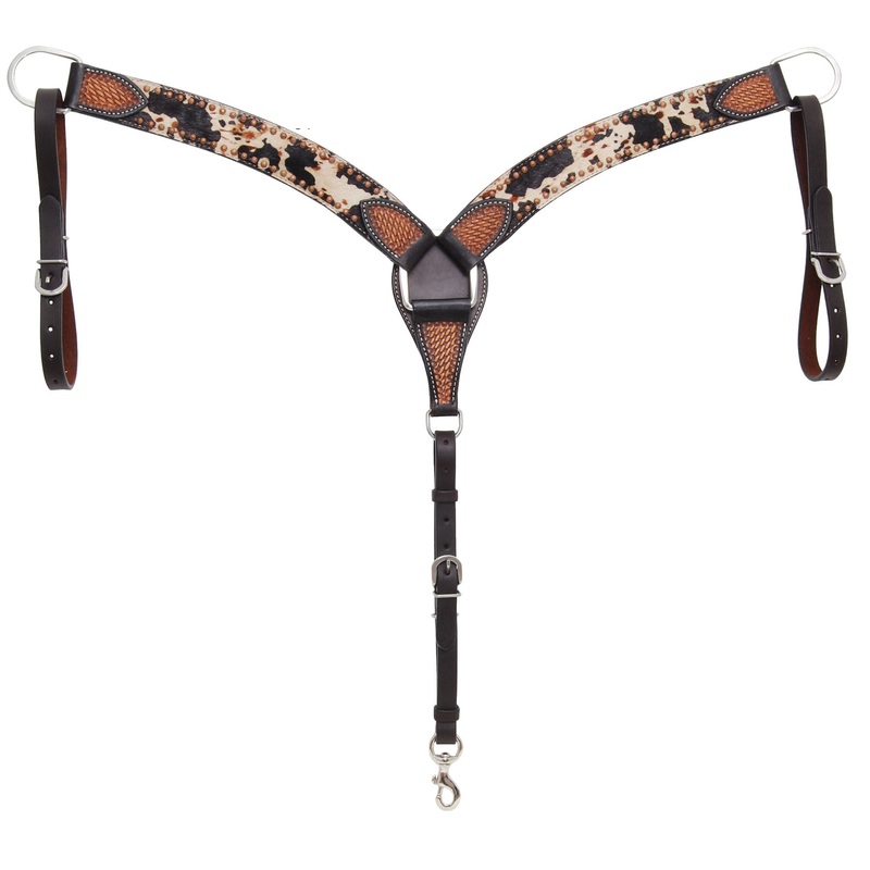 Rafter T Peppered Hide Breast CollarPeppered cowhide and basketweave! The Rafter T Peppered Hide Breast Collar features a hair-on overlay that is trimmed in copper dots and has basketweave ends. Made with heavy-duty tugs and hardware. Breast straps are con