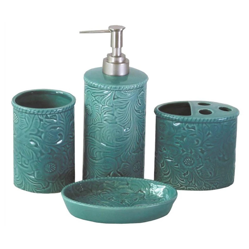 Savannah 4 Piece Bathroom Countertop Accessory Set, TurquoiseEvoke a dramatic Western flair to your bathroom with our Savannah Ceramic Countertop Bathroom Set. This set showcases damask-inspired swirling florals embossed on ceramic for added texture and ro