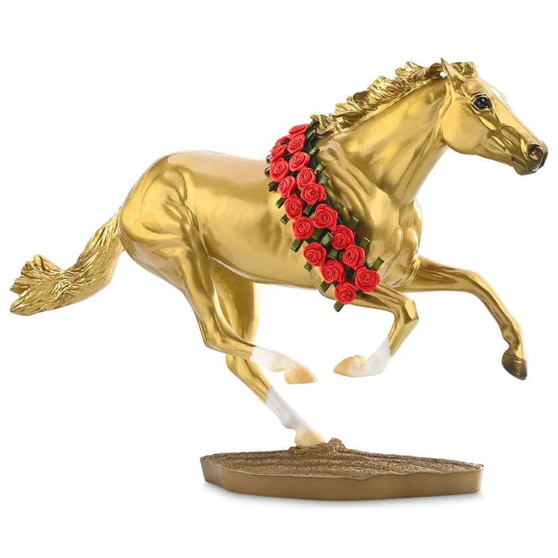 Youll be hard pressed to find a better-known racehorse than Secretariat. Affectionately known as Big Red, the chestnut stallion raced into the hearts of a nation in 1973s Kentucky Derby, which he not only won, but set a speed record of 1:59 2/5, which still stands today! After handily winning the Preakness Stakes and again setting a record he continued on to make his biggest splash yet at the Belmont Stakes. Secretariat not only became the first horse to win the Triple Crown in 25 years, but he also won the race by a world-record 31 lengths! Secretariat forever cemented his name as well as the names of his owner Penny Chenery, jockey Ron Turcotte, and trainer Lucien Laurin into racing history. 2023 marks the 50th anniversary of Secretariats iconic Triple Crown win. In celebration of this occasion, this special limited-edition Secretariat has been painted a glossy metallic gold, which is accented by his white blaze and leg markings. This shining emblem of racing history is adorned by a beautiful rose garland.This is truly a special piece for the Secretariat fan!Traditional | 1:9 scale | Ages 8+