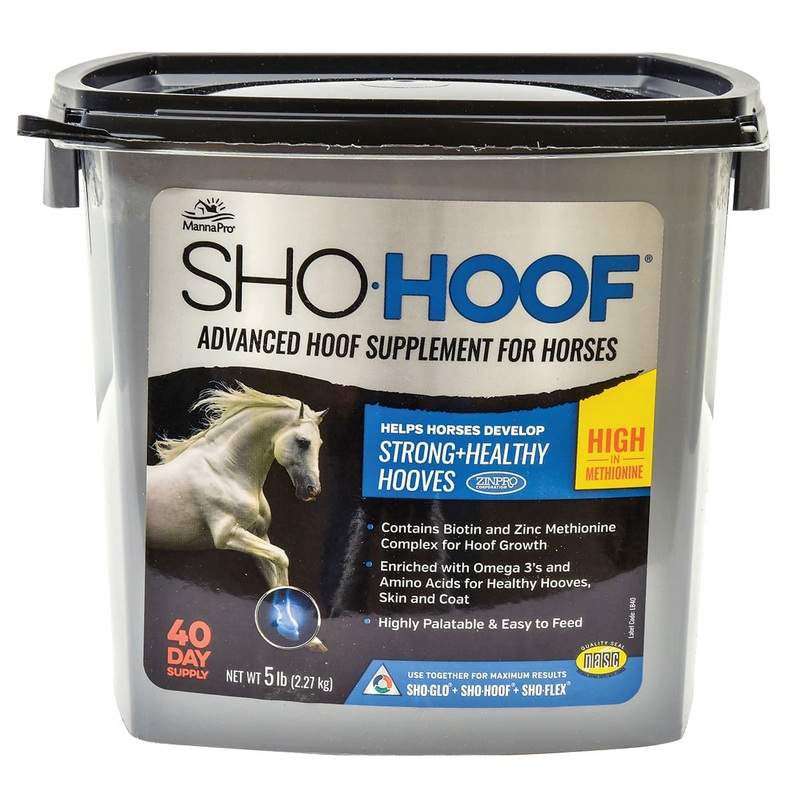 Sho-Hoof Hoof Supplement for HorsesA hoof supplement that helps maintain and improve hoof condition, thus promoting soundness.Contains: 20 mg biotin, plus Methionine, Chelated Zinc and Antioxidants. Pelleted. Key Points of Sho-Hoof:Best choice for horse ho