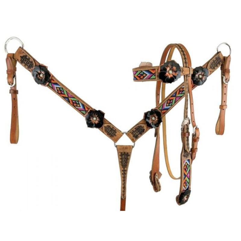 Showman Beaded Aztec & 3D Leather Flower Tack SetAztec beaded Browband Headstall and Breast collar Set w/ 3D leather painted flower accents. This set features a medium colored leather with hand painted 3D leather flowers on the breast collar and the headst