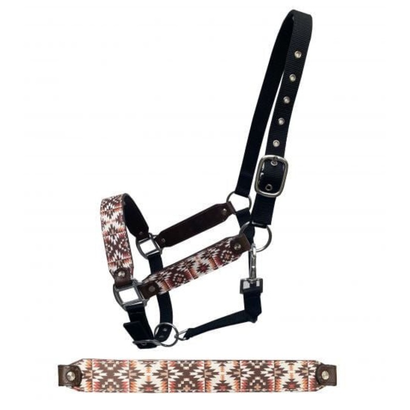 Showman Southwest HalterPremium Nylon Horse Sized 3 Ply Halter with Navaho print overlay on cheeks and nose.Comes equipped with heavy duty satin nickel hardware and a heavy duty snap throat latch. Easily adjusts at crown and nose. Average horse size: 800-1