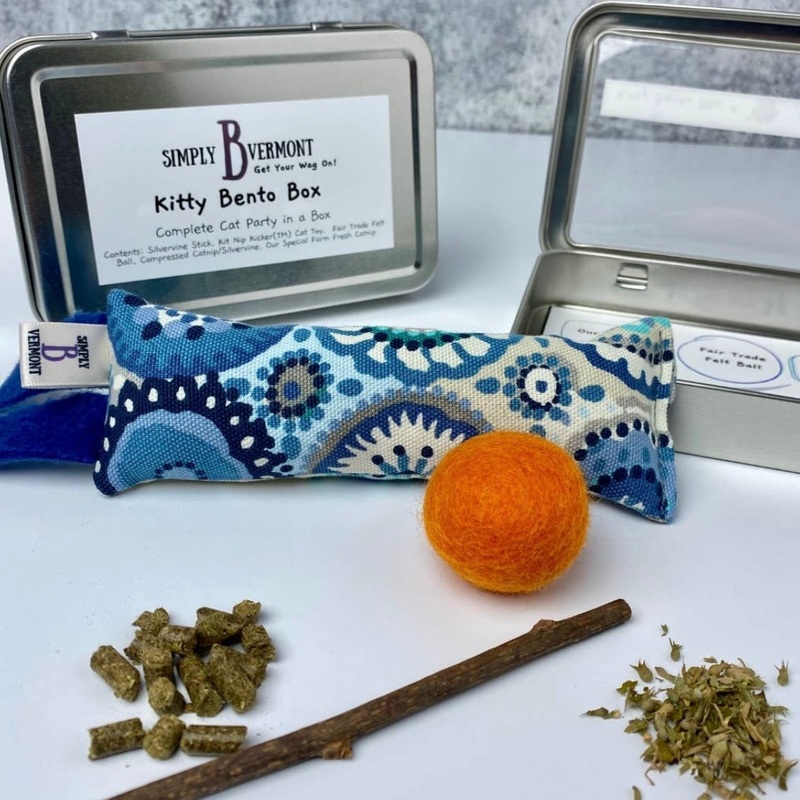 The Kitty Bento Box is a complete catnip party all packaged in one tin. Contains 5 toys: Kit Nip Kicker Cat toy, Fair Trade Felted Ball, Silvervine Stick, Catnip, Compressed Catnip, and Silvervine Pellets. Assorted colors. Vermont-made by a woman-owned sma