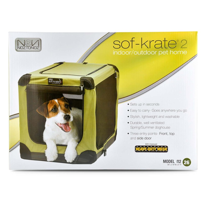 The Sof-Krate N-Series Pet Crate is a versatile, indoor/outdoor pet home that provides comfort and ventilation for your pet. Perfect for use at home, in the car, RV, hotels, camping, or the park, this crate offers convenience and portability. It features a strong steel frame that folds flat for easy storage, and has top, front, and side door entries for easy access. The heavy-duty zippers are secure with a door lock, and ventilated mesh panels ensure airflow. A water-resistant base and rounded corners protect both your pet and your home dcor.