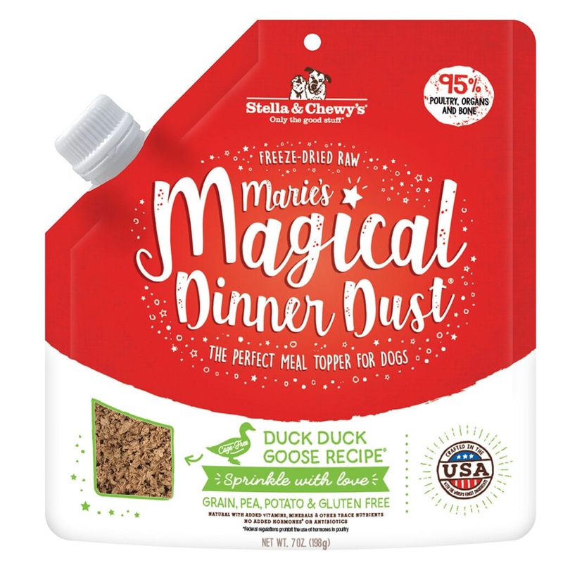 Duck with ground bone, turkey, turkey liver, turkey heart, goose, turkey gizzard, pumpkin seed, organic cranberries, organic spinach, organic broccoli, organic beets, organic carrots, organic squash, organic blueberries, fenugreek seed, potassium chloride, dried kelp, sodium phosphate, tocopherols (preservative), choline chloride, salt, dried pediococcus acidilactici fermentation product, dried lactobacillus acidophilus fermentation product, dried bifidobacterium longum fermentation product, dried bacillus coagulans fermentation product, zinc proteinate, iron proteinate, taurine, calcium carbonate, vitamin E supplement, thiamine mononitrate, copper proteinate, manganese proteinate, sodium selenite, niacin supplement, d-Calcium pantothenate, riboflavin supplement, vitamin A supplement, vitamin D3 supplement, vitamin B12 supplement, pyridoxine hydrochloride, folic acid.