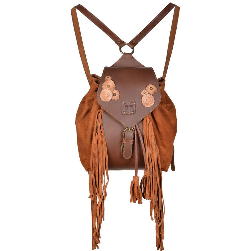 STS Sheridan Flower BackpackAdd a touch of Southwestern appeal to your style with the Sheridan Flower Backpack.Features & Benefits:suede with full grain leather trimflower detail accentsbuckle & drawstring tip closurefringe accentsexterior zip pockettwo in