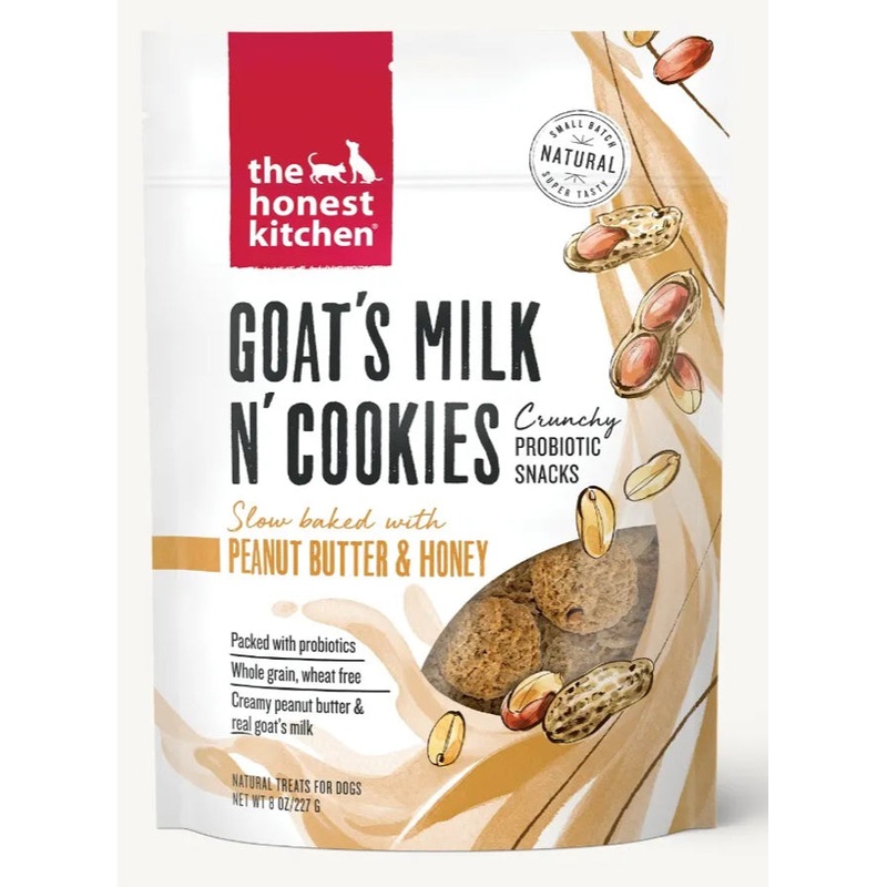 We believe that good dogs shouldn’t settle for boring biscuits! That’s why we created these rich peanut butter treats for dogs. With each bite of our Goats Milk N’ Cookies, your pup gets a delicious dip of rich goats milk, creamy peanut butter and a touch of sweet honey. Each little cookie is slow baked in small batches and full of probiotics to support a happy belly. Flavor meets function in every bite.