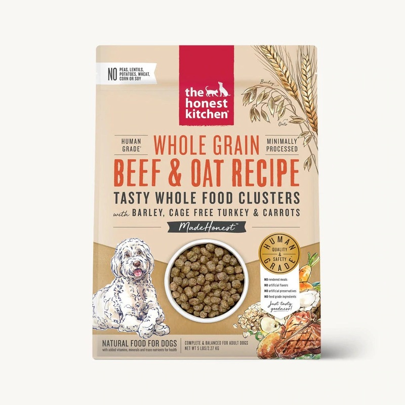 We believe that human grade, minimally processed whole foods provide pets the best nutrition possible. Created with a veterinary nutritionist, these 100% human grade clusters are made with real whole foods youd recognize from your own kitchen, like ranch raised beef and cage free turkey. Theyre MadeHonest with human grade, nutrient-rich ingredients, cold-pressed into bite sized clusters, roasted and dehydrated to maintain the nutrients, aroma and taste of whole foods. Our Whole Grain Beef, Oat & Turkey Whole Food Clusters give you the same scoop & serve convenience as other dry dog foods, while giving your pup minimally processed, 100% human grade taste and nutrition.