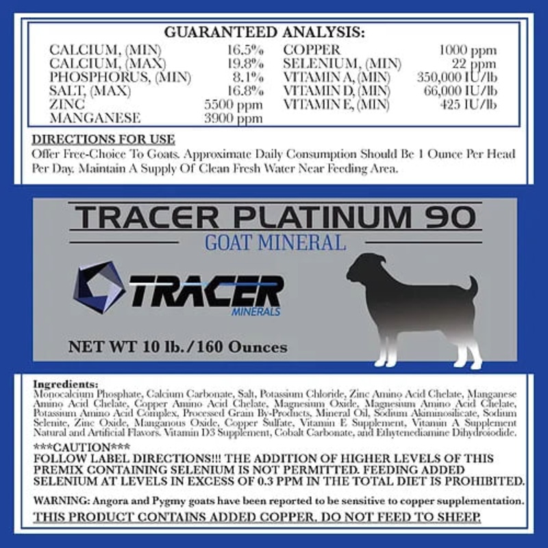 Tracer Platinum Goat 90This specially designed free choice goat formula is very palatable and has good acceptance as a free choice mineral. The preferred dose of this product is 1 ounce per head per day for adult goats and ounce for growing goats. This min