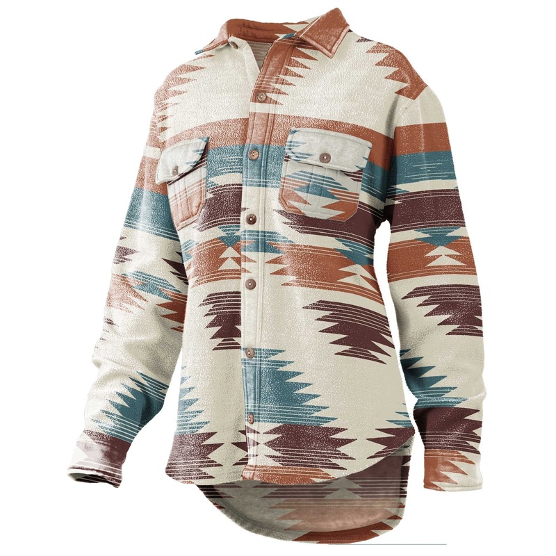 Turnrows Women's Aztec Reversed Fleece ShacketLook great in this Southwestern inspired Aztec Shacket! Reversed fabric so the fluffy side is out and then overprinted with an Aztec print. The printing is very soft to the hand and touch.