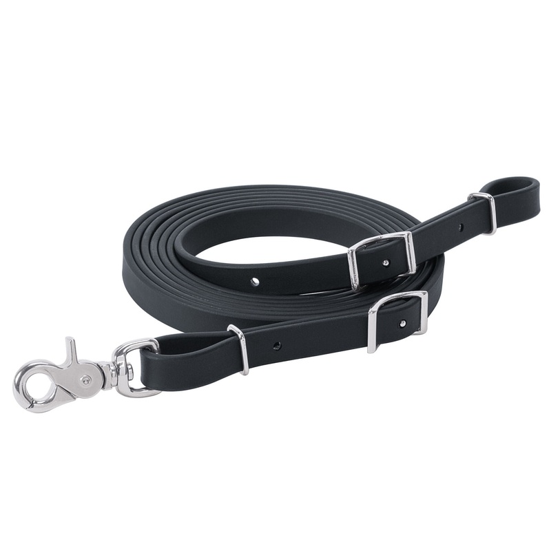 Weaver Leather Trail Gear Trail ReinConstructed from our exclusive coated webbing, Brahma Webb. This extra-long trail rein offers the look of leather with the easy care and weather resistance of synthetic webbing. Nickel plated conway buckles and scissor s