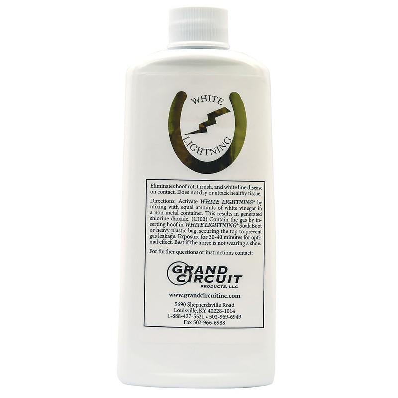 White Lightning Liquid eliminates thrush, hoof rot, and white line disease on contact without drying out or attacking tissue. Contains Chlorine Dioxide which is highly effective in neutralizing bacteria, fungus, and yeast. A revolutionary treatment for horses, donkeys, cattle, and pigs. Comes in your choice of 8 oz or 64 oz.