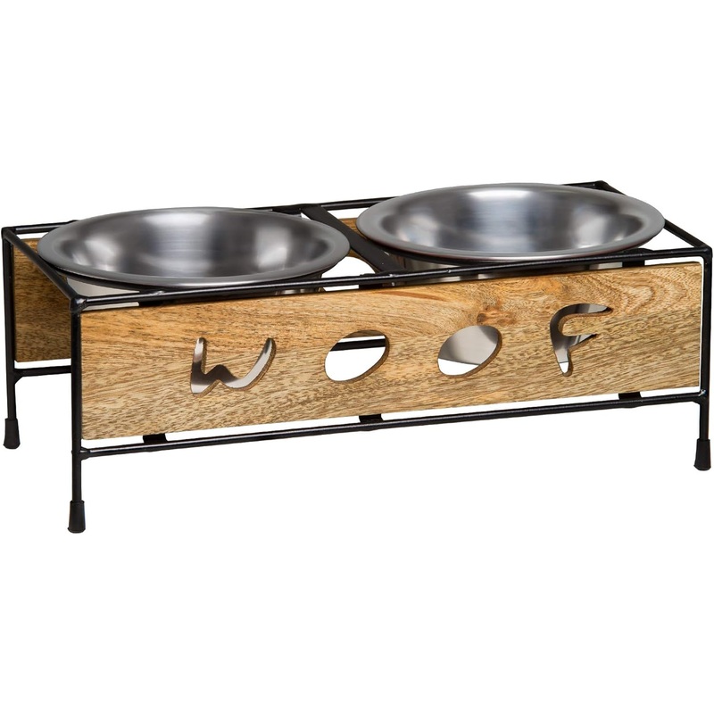 The Black Label Wooden Woof Cut Dog Diner combines wood, wrought iron and stainless steel to to create a elegant and fun look. The stainless steel bowls are veterinarian recommended, easy to clean and dishwasher safe. The wood surfaces are treated with a safe and durable coating to preserve and protect. Plus, the black powder coated wrought iron base has rubber feet that prevent this diner from skidding and sliding.