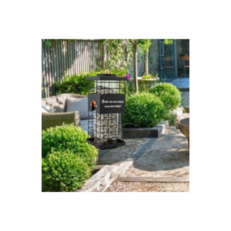 Motivational message embellishment enhances this Farmhouse styled seed feeder. The feeder has a squirrel and predator resistant cage to protect seed from larger birds. Metal 1-in grid keeps larger birds and squirrels out! Generous sized plastic tube feeder holds 2 lbs. of mixed seed. The matte black powder coated finish and copper colored accents make this a winner for birds and bird watchers. Vented to keep seed fresh with a copper accent seed port. Cage provides plenty of perching space and the seed catcher bottom saves seed from being wasted. Metal cable included for hanging. Decorative and functional, a beautiful addition to any backyard or garden!