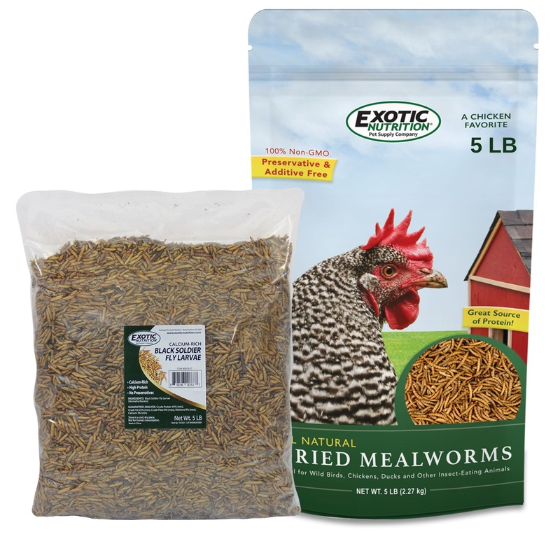 Includes (1) Dried Mealworms 5 lb. bag & (1) Black Soldier Fly Larvae 5 lb. bagAll-natural feed supplement for poultry & wild birds like chickens, bluebirds, ducks, turkeys, etc.100% GMO free- no antibiotics, hormones, chemicals or antioxidantsProvides enr
